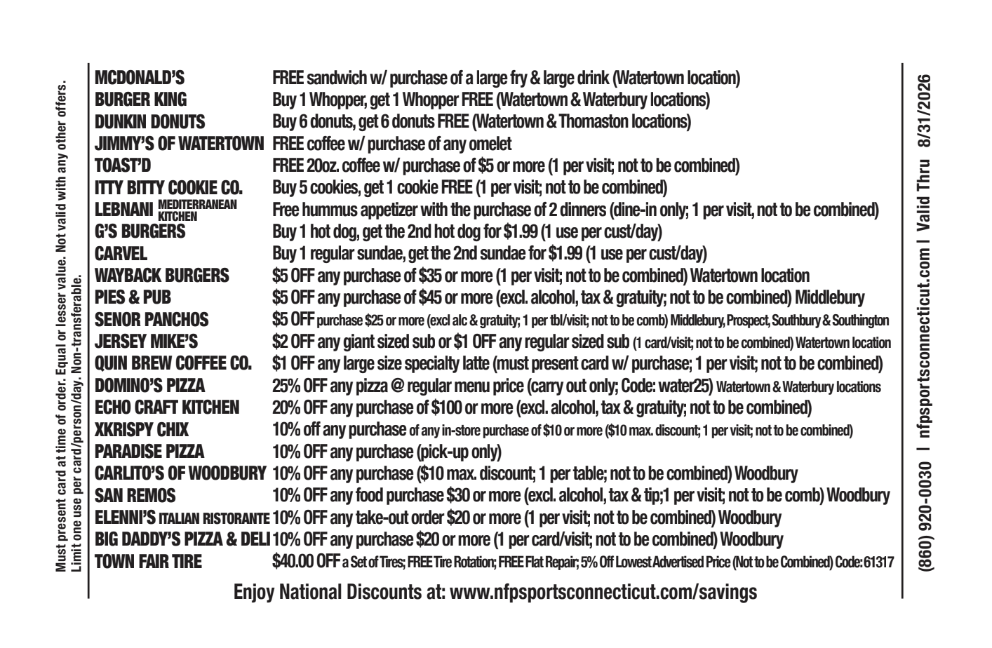 Your card also gives you access to the NFP Sports Savings Club. It includes manufacturer coupons, online discounts & travel discounts. Check your card for details.